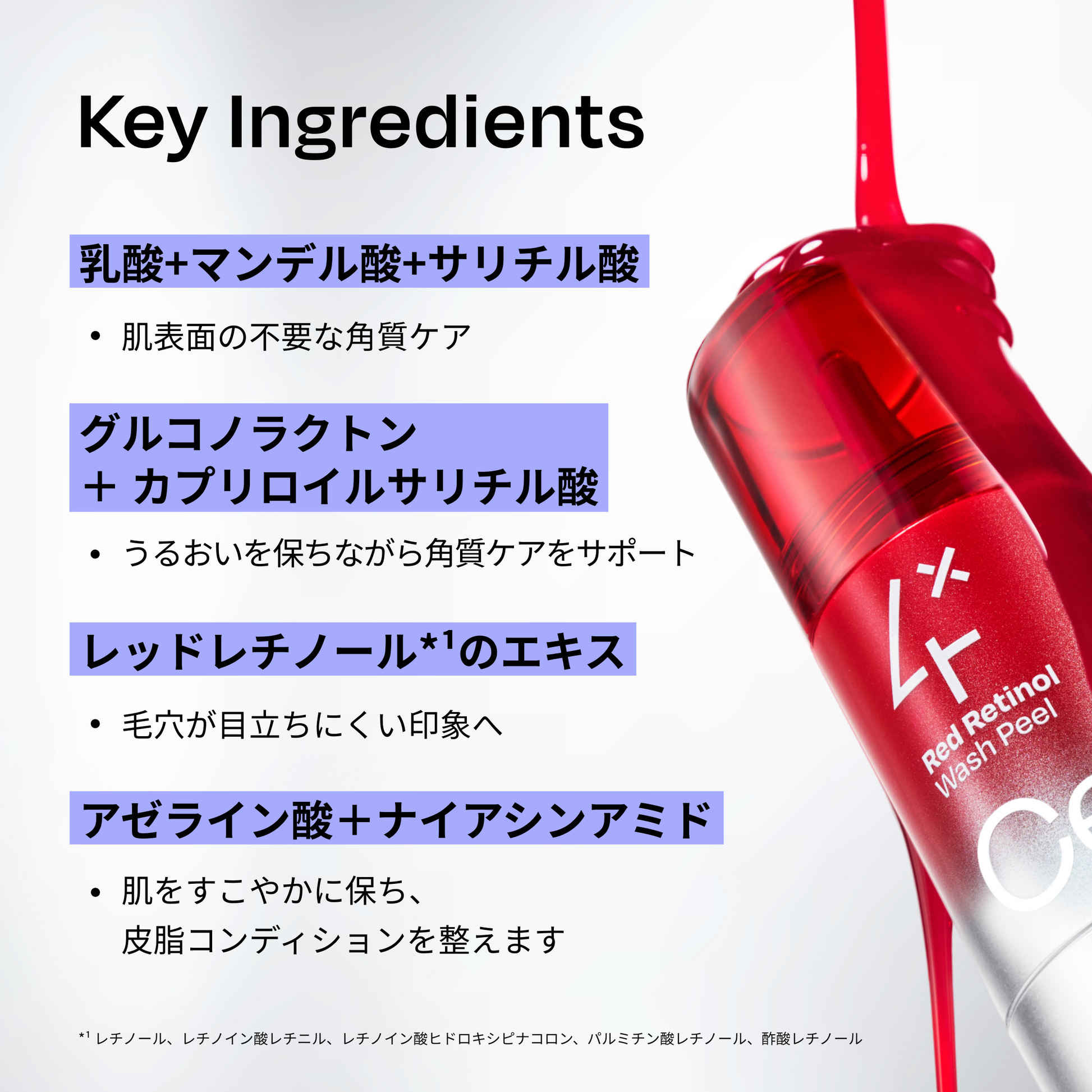 水、乳酸、水酸化K、グルコノラクトン、マンデル酸、ジプロピレングリコール、オクチルドデセス-16、グリコール酸、メチルプロパンジオール、パンテノール、1,2-ヘキサンジオール、グリセリン、クエン酸、ヒドロキシエチルセルロース、ペンチレングリコール、シアノコバラミン、ポリグリセリン-3、(アクリロイルジメチルタウリンNa/VP)コポリマー、サリチル酸、キサンタンガム、香料、レチニルパルミテート、ピーナッツ油、バニリルブチルエーテル、ポリアクリレートクロスポリマー-6、エチルヘキシルグリセリン、ヒドロキシプロピルデンプンリン酸、スフィンゴモナス培養エキス、カプリロイルサリチル酸、ブチレングリコール、ジメチルイソソルビド、リン酸二Na、ポリソルベート60、トコフェロール、ハイビスカス花エキス、ナイアシンアミド、レチニルアセテート、PPG-13-デシルテトラデセス-24、リン酸Na、レチノール、カプリル酸/カプリン酸トリグリセリド、ヒドロキシピナコロンレチノエート、イソプロピルラウロイルサルコシネート、レチニルレチノエート、ベンゾトリアゾリルドデシルp-クレゾール、クズ根エキス、テイオウマツ葉エキス、ニレ根エキス、ツキミソウ花エキス、ジエチルヘキシルシリンギリデンマロネート、アゼライン酸