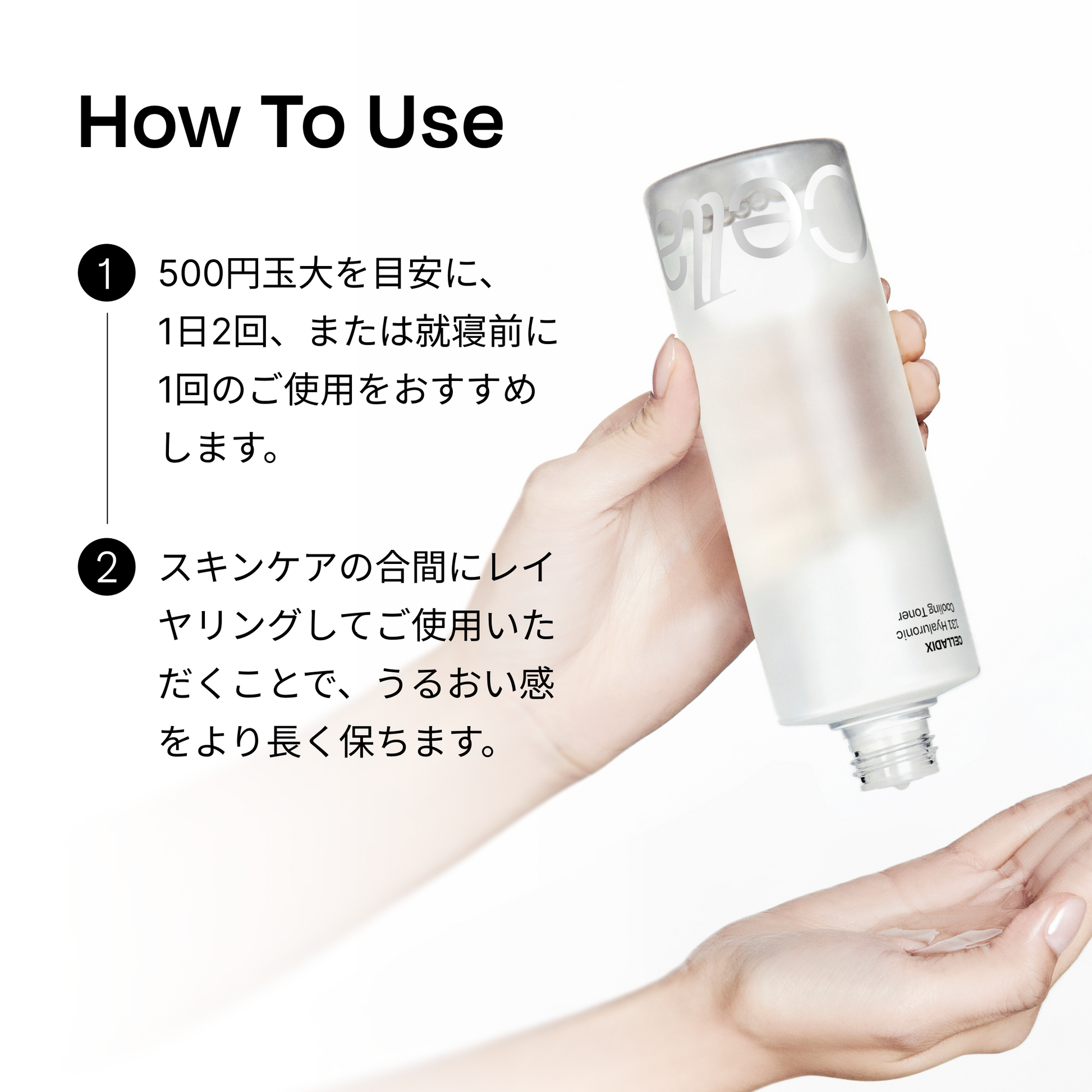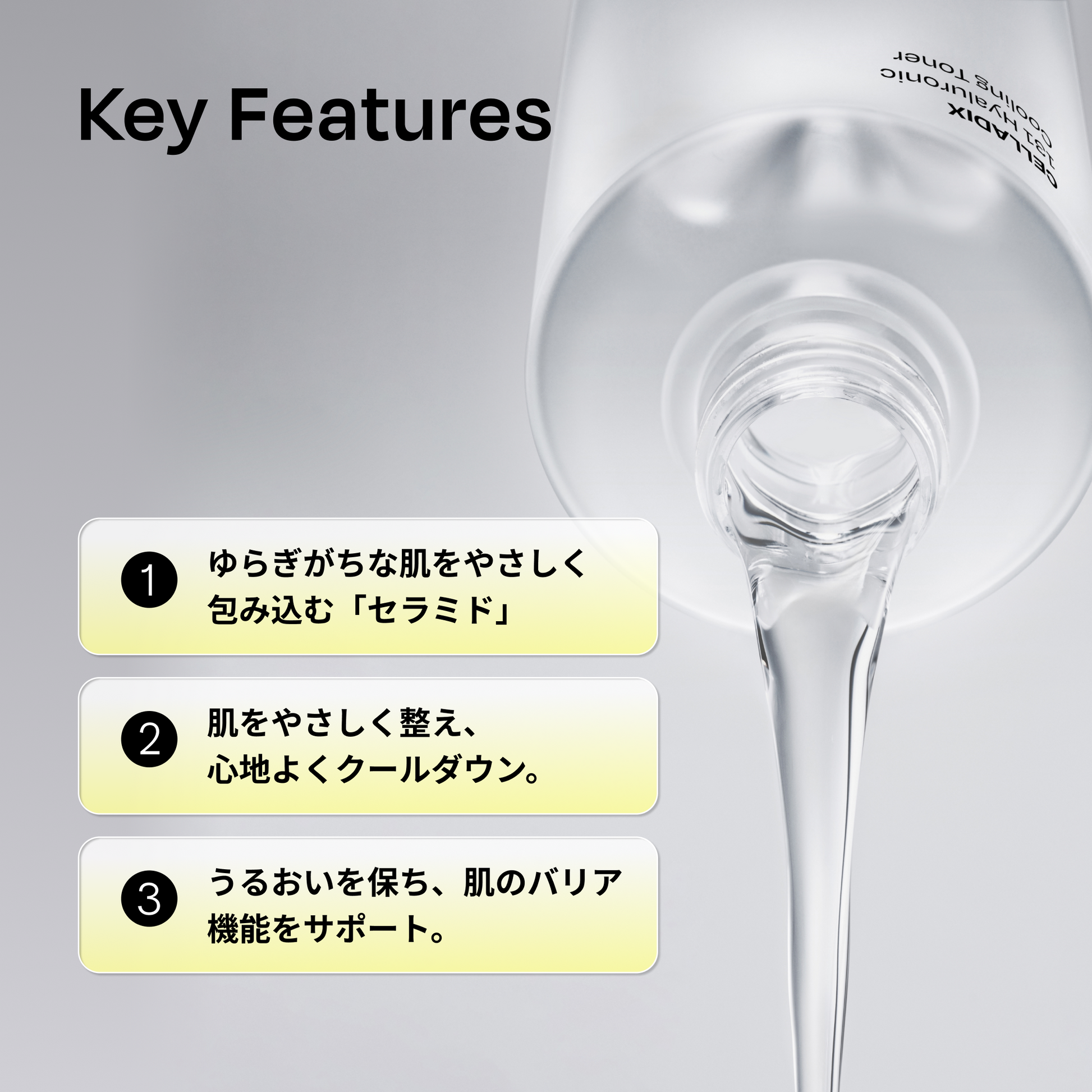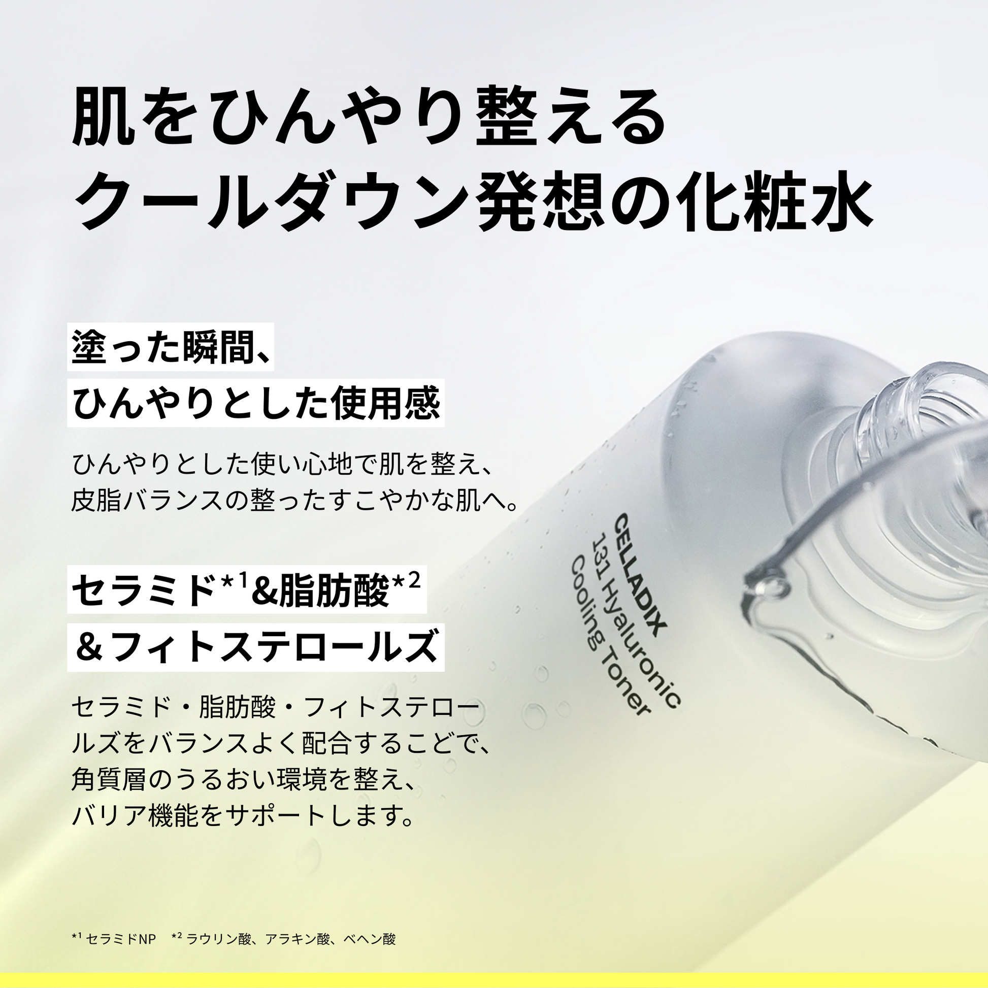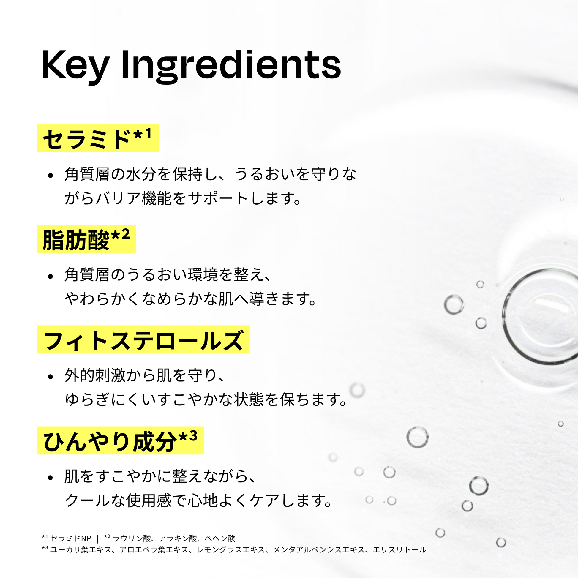水、BG、グリセリン、1,2-ヘキサンジオール、ナイアシンアミド、パンテノール、キシリトール、ラウリン酸ポリグリセリル-10、プロパンジオール、ベタイン、トレハロース、エチルヘキシルグリセリン、アデノシン、アルギニン、カルボマー、EDTA-2Na、アラントイン、ユーカリ葉油、乳酸桿菌培養溶解質、セイヨウタンポポ葉エキス、水添レシチン、トリ(カプリル酸/カプリン酸)グリセリル、ペンチレングリコール、オウゴン根エキス、フィトステロールズ、シア脂、ユーカリ葉エキス、アロエベラ葉エキス、レモングラスエキス、メンタアルベンシスエキス、キサンタンガム、エリスリトール、加水分解エンドウタンパク、カプリリルグリコール、ステアリン酸ポリグリセリル-10、スクアラン、ポリリシン、セラミドNP、ステアリン酸
